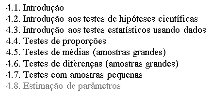 Este capítulo discute as técnicas básicas de Inferência Estatística: testes de significância e testes de hipóteses, e estimação de parâmetros. Para acessar cada seção, clique na aba correspondente na barra acima.